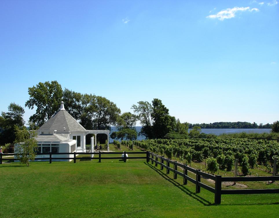 The outside tables are stunningly situated along rows of grapevines and within view of Lake Ontario.